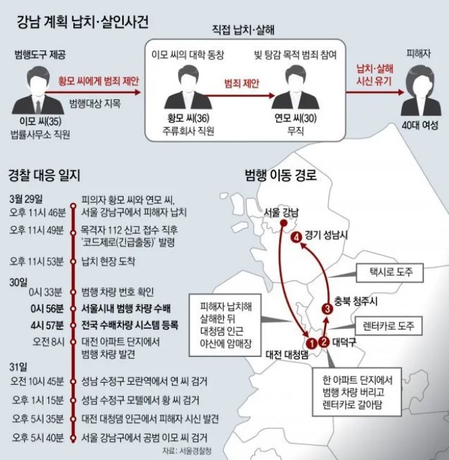 이경우가 범행 도구를 제공하고 범행은 황대한과 연지호가 결행했으며 범인 3명은 추적을 피하고자 대포폰과 현금만 사용했고 옷도 갈아입으며 택시를 여러 번 갈아탔으며 살해 당일까지 3개월여간 미행하였으며 살해 당일에도 5시간 동안 미행을 한 뒤 납치 후 6시간 만에 살해했다고 합니다.