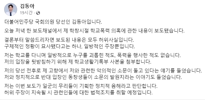 이에 대한 대응으로 김 당선인은 페이스북을 통해 "학교에서 누구를 일방적으로 괴롭힌 적도, 폭력을 행사한 적도 없다"고 강조하며, 자신의 학교생활기록부를 공개했습니다.