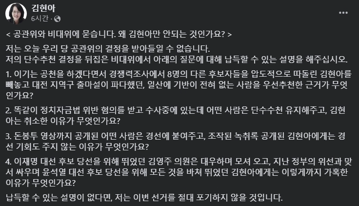 이에 김현아 전 의원은 공천 취소 결정에 강하게 반발했습니다. 페이스북을 통해 자신만이 공천에서 제외된 이유가 무엇인지 반문하며 비대위와 공관위의 결정을 받아들일 수 없다고 주장했습니다.