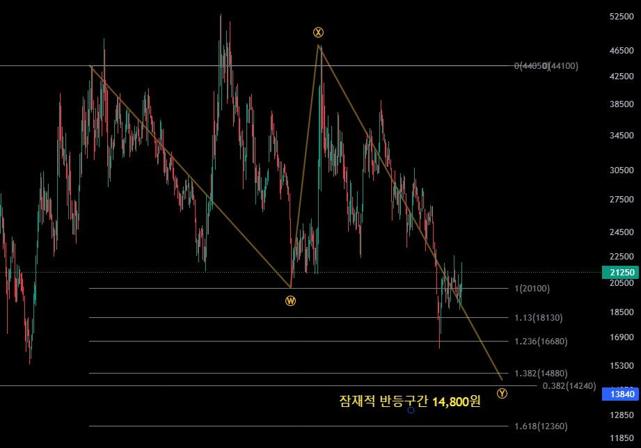 마크로젠은 WXY 하락파동을 그리고 있으며 마지막 Y파동을 그리고 있습니다. Y파동은 335ABC 형태로 마지막 5파 하락을 보여주고 있습니다. 잠재적 반등구간은 14800원을 예상하고 있습니다.