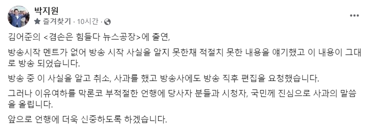 방송이 끝난 후, 박 의원은 자신의 페이스북을 통해 방송 시작 사실을 몰랐으며, 적절치 않은 내용이 방송된 것에 대해 사과했다고 밝혔습니다.