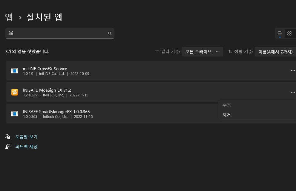 이니세이프(INISAFE)를 삭제하는 방법은 다음과 같습니다.