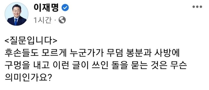 이재명 대표는 페이스북을 통해 먼저 오후 1시쯤 "누군가가 부모 무덤 봉분과 사방에 구멍을 내고 이런 글이 쓰인 돌을 묻는 것은 무슨 의미인가"라고 묻는 글을 올렸습니다.