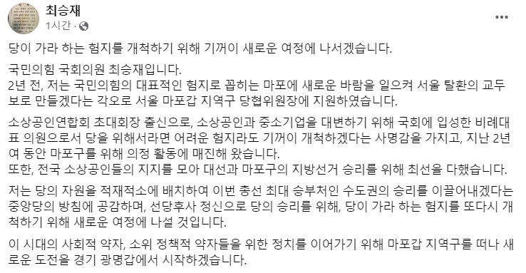 최승재 의원은 이전까지 서울 마포갑 출마를 준비해왔으나, 최근 이용호 의원이 서울 서대문갑으로 출마지를 변경한 데 이어, 자신 또한 광명갑으로 출마지를 옮기기로 결정했습니다.